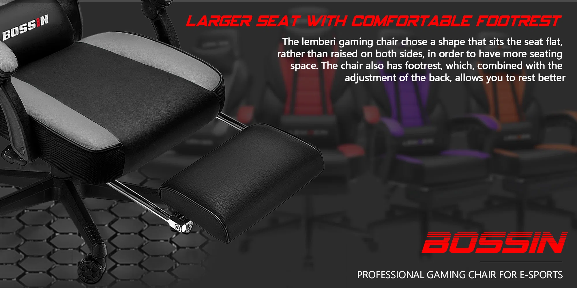 DetailThe Bossin gaming chair is designed for your every need! The gaming chair matches all locations. 360° Swivel and smooth racing caster wheels for mobility; 90°-180° reclining for working, gaming, reading, or napping; retractable footrest for relaxing; adjustable seat height, 400 lbs. capacity; head pillow and lumbar pillow for all body shapes. The winged back provides multi-point body contact to share the pressure and save your spine and lumbar with ergonomic back and massage support. Lean your legs more comfortably with a bucket seat design. The side wing frame has been thinned and contains a more soft filling. Alloy frame covered in quality PU leather and 6 inches of high-density foam for comfort. It is stable enough to serve for years.