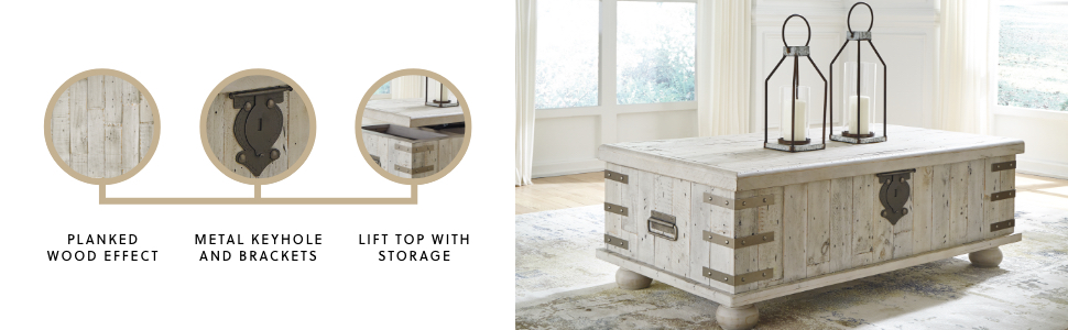 HANDSOMELY CRAFTED: Made of acacia wood, veneer and engineered wood. Designed with a lift top with 3 storage spaces inside