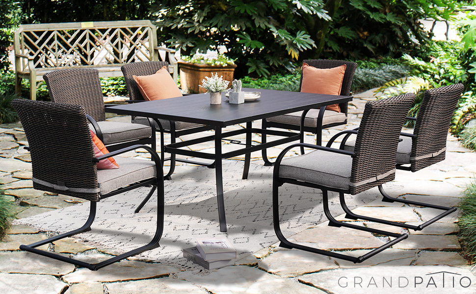 MODERN DESIGN: Outdoor Wicker Chairs are designed with spring motion to provide a smooth and comfortable rocking motion. It can hold up to 330 lbs respectively. The large long dining table with powder coated steel frame, weather-resistant, UV-resistant.