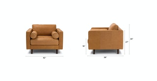 Style/typeMid-century modernGeneral Dimensions34"H x 42"W x 38"DWeight (lbs)70Seat Height19"Seat Depth24"Arm Height27"Wood StainWalnutUpholstery ColorCharme TanMaterialsKiln dried solid wood, high density foam, polyester, duck feathers, full-aniline leatherSKU No.SKU333BBox Dimensions23"H x 42"W x 44"L