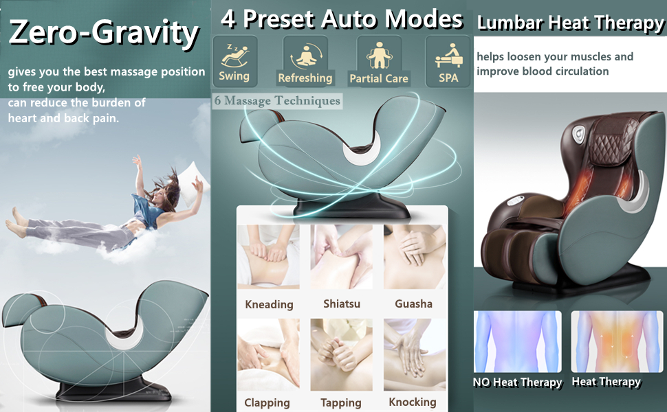 - Zero-Gravity Massage: The Zero-Gravity Massage gives you the best massage position to free your body, can reduce the burden of heart and back pain.