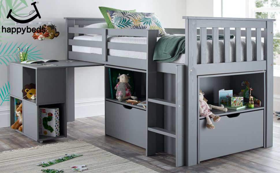 The Milo Mid Sleeper bed is a modern sleep station with beautiful grey or white finish. This cosy cabin bed will be the perfect addition to your child's room. It features a pull-out desk, large shelves and storage spaces which will help your child to be organized. The shelf unit is not attached to the bed frame and can be placed separately in the room. The bed is constructed strong and sturdy form quality wood. The ladder and the desk casters can be placed on either the left or the right side depending on the room requirements. The head and foot end are open slatted and there are guard rails to both side. The bed comes flat packed for ease of delivery and storage. Easy self assembly.
